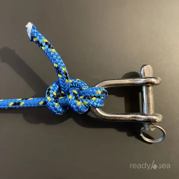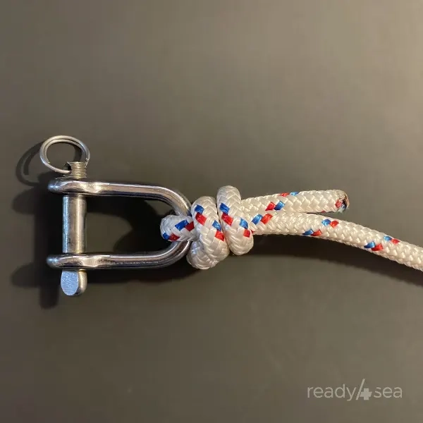 - How to Tie: Pass the line inside the halyard shackle or fitting. Then make a first turn around the standing part, and continue with a second turn further along the line than the first one. Bring the working end back over both loops and feed it through the turns. It should be “exiting” the knot parallel to the incoming standing line. Pull the standing part to snug the hitch. The result is a compact noose that grips the shackle while allowing adjustment if necessary.