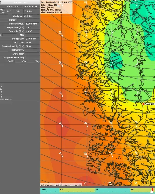 We’re still cruising Patagonia. It looks like a great day for sailing into Canal Wide (red dot, middle right). Only 18 knots are forecast, and even less further north.